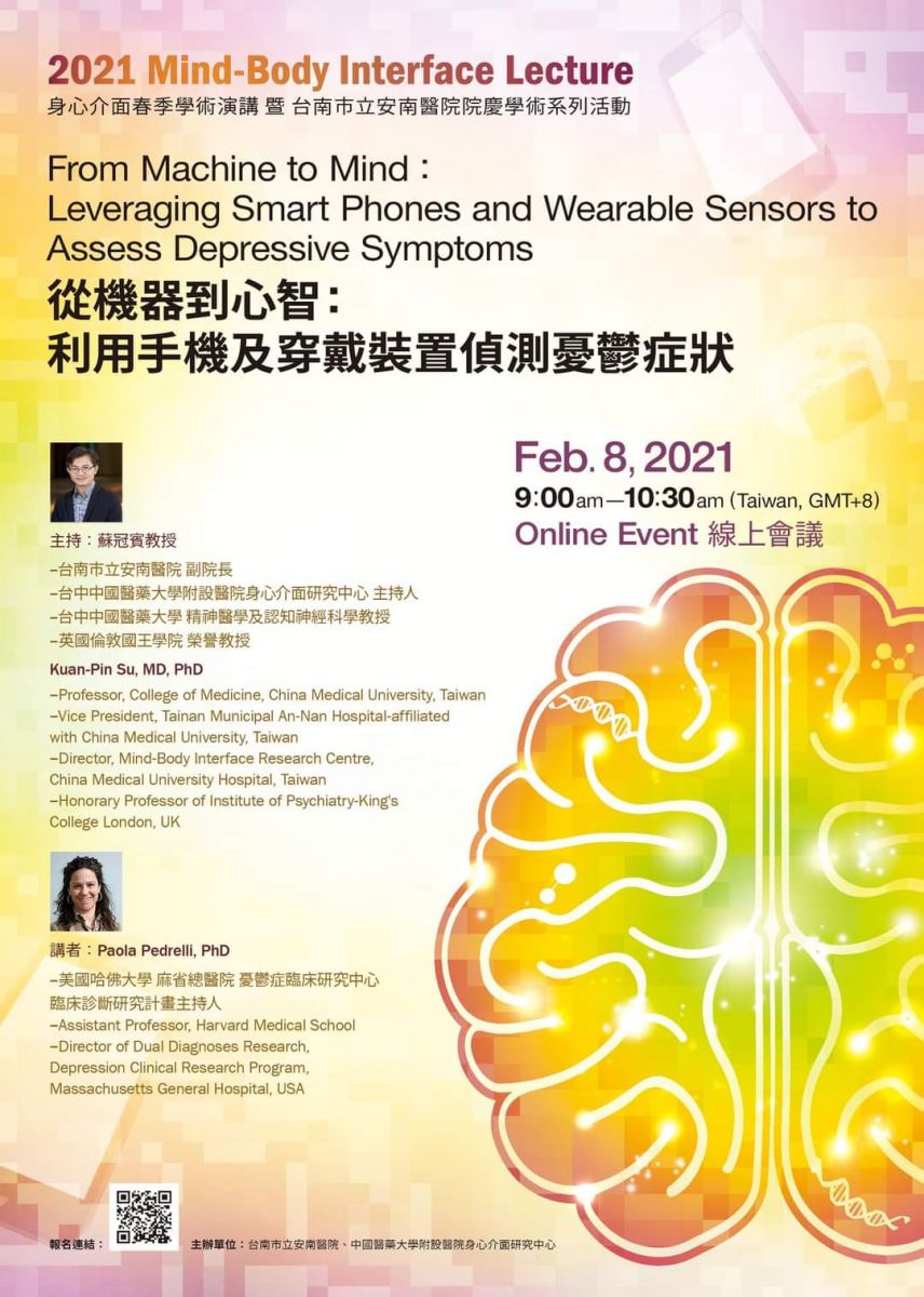 隨著智慧手機的普及,加上日新月異的穿載式配備,「系統性」、「連續性」、「大量性」的受試者生物指誌得以被收集,這種前所未有的「即時性」、「動態性」的數據分析,更提供了醫學上事先診斷和預防的可能性。由TSNPR學會協辦,2021身心介面春季演講在2/8上午舉行,由學會理事長精神科教授蘇冠賓醫師主持,美國哈佛大學Dr. Paola Pedrelli主講「利用手機及穿戴感應裝置偵測憂鬱症狀」,線上會議,吸引上百人全球同步聆聽。