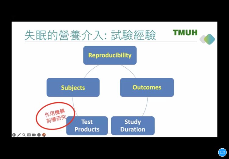 講座由臺北醫學大學附設醫院精神科暨睡眠中心主任李信謙副教授分享「睡眠障礙的營養介入: 實證與試驗經驗談」。李主任為國內投入睡眠研究之權威,由於保健營養品相較於藥物之副作用較低,故大眾的接受度較高,但其效果仍有許多問號。李主任整理了許多與改善睡眠障礙相關的實證研究結果,並一一解析;相較於藥物臨床試驗,保健營養品之研究再現性有其限制,源自於收案標準、主客觀效果結果評估及試驗商品之品質,不似藥物或一般疾病容易定義,因此在考慮營養補充品作為失眠改善之輔助時,仍應注意其有無研究實證支持及試驗之品質。