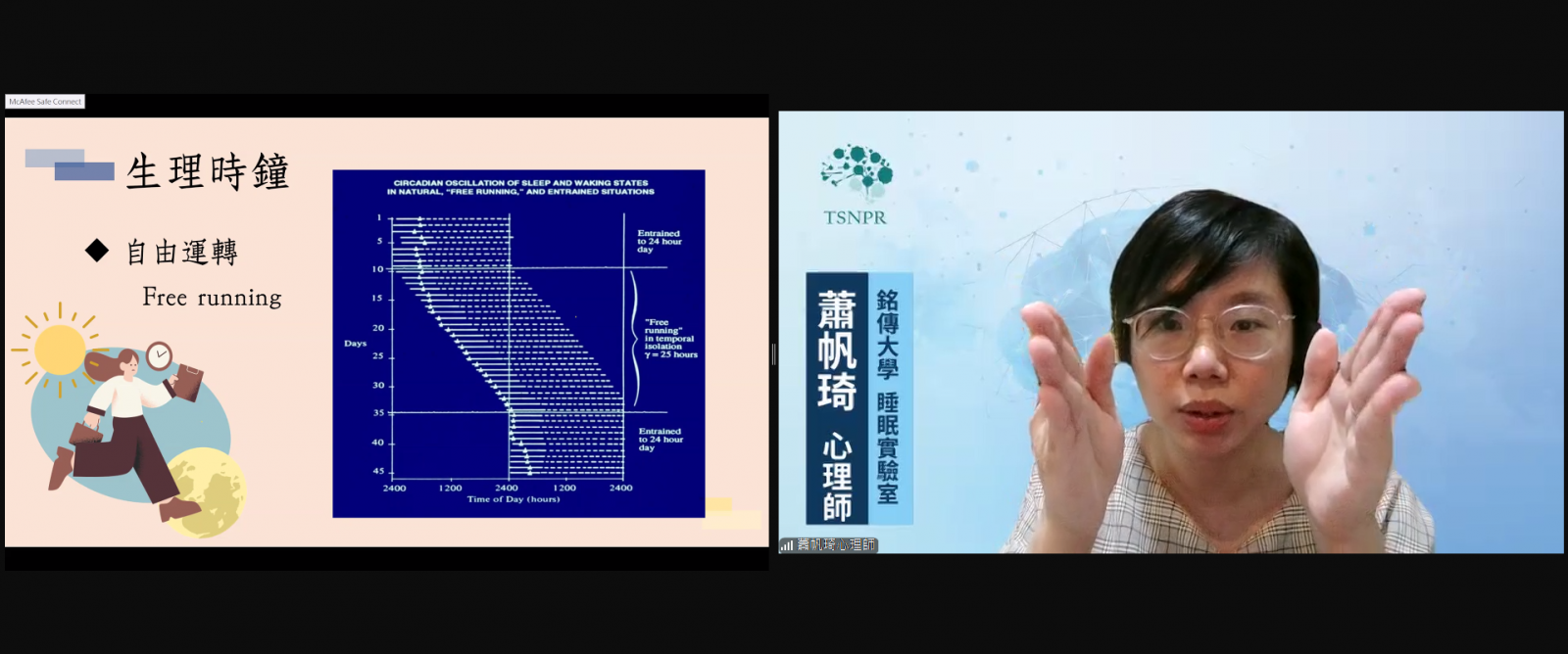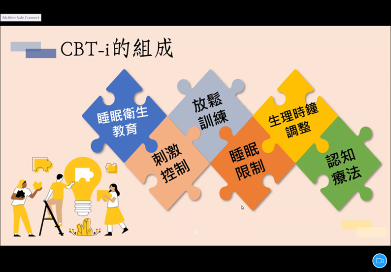第二部份的演講由銘傳大學諮商臨床與工商心理學系 蕭帆琦助理教授主講「失眠認知行為治療 (CBT-I)」。認知行為治療雖然較少被民眾所認識,但其實已有大量實證研究證實了CBT-I用來改善失眠的效果,優於藥物介入,且效果持續時間更長。蕭教授在演講中介紹了CBT-I的架構,詳細說明理論機制、治療內容及治療效果,同時也比較了簡短版CBTi(BBTi)與CBTi的差異。