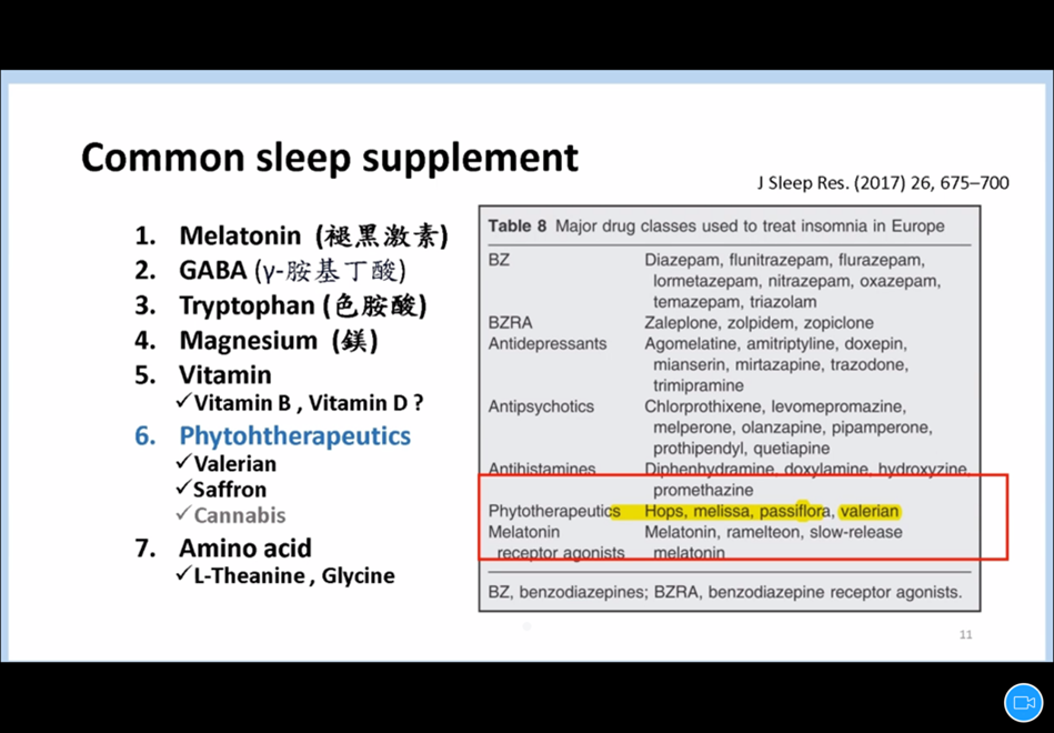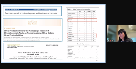 講座第三部份由中國醫藥大學新竹附設醫院身心醫學科鄭映芝醫師,以其在臨床上幫助患者改善失眠問題的經驗來分享。面對失眠問題,鄭醫師強調需要與醫師好好討論,找出真正的問題,才能對症下「藥」,而這個「藥」是否需搭配或輔助營養或其他生活型態的改變,仍是仰賴每個人不同的失眠原因。鄭醫師也針對常見的失眠保健營養品進行文獻探討,包括:番紅花、GABA、褪黑激素、色胺酸、鎂、葉酸、B群等等。,對於營養介入用於改善睡眠改善,挑選有臨床實證支持的營養品,並且攝取到足夠的劑量,是鄭醫師提醒的二大基本原則。