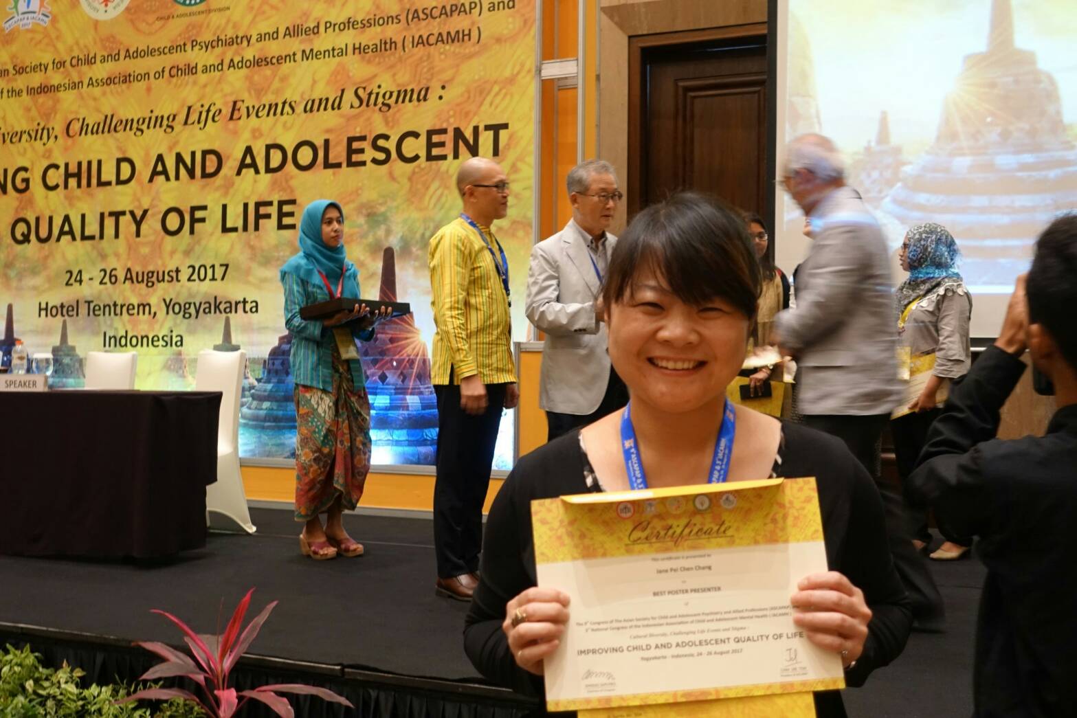 恭喜張倍禎醫師於2017年8月24-8月26日在印尼日惹所舉行的第九屆亞洲兒童青少年精神醫學會獲得最佳壁報論文獎!獲獎之論文題目:注意力不足過動症孩童之多元不飽和脂肪酸攝取與其延宕厭惡反應之相關性. Congratulations to Dr. Jane [‧‧‧‧‧]