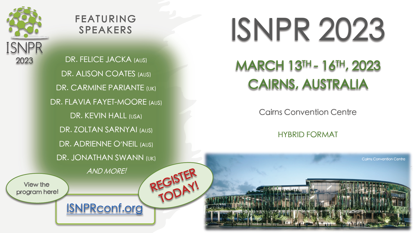 國際營養精神醫學研究學會 (ISNPR) 2023年研討會將於今年3月13-16日於澳洲凱恩斯 (Cairn) 舉辦,現已開放報名,早鳥優惠至2023年2月13日截止,歡迎踴躍報名!