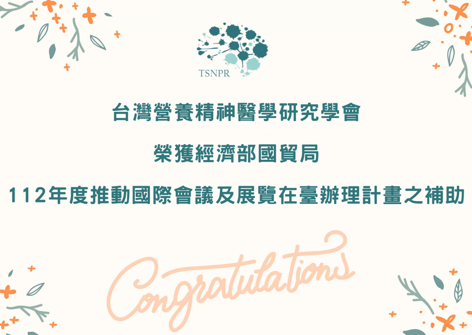TSNPR榮獲經濟部國貿局112年度推動國際會議及展覽在臺辦理計畫之補助,將爭取114年 (2025年)「國際營養精神醫學研究學會年會」在臺辦理!