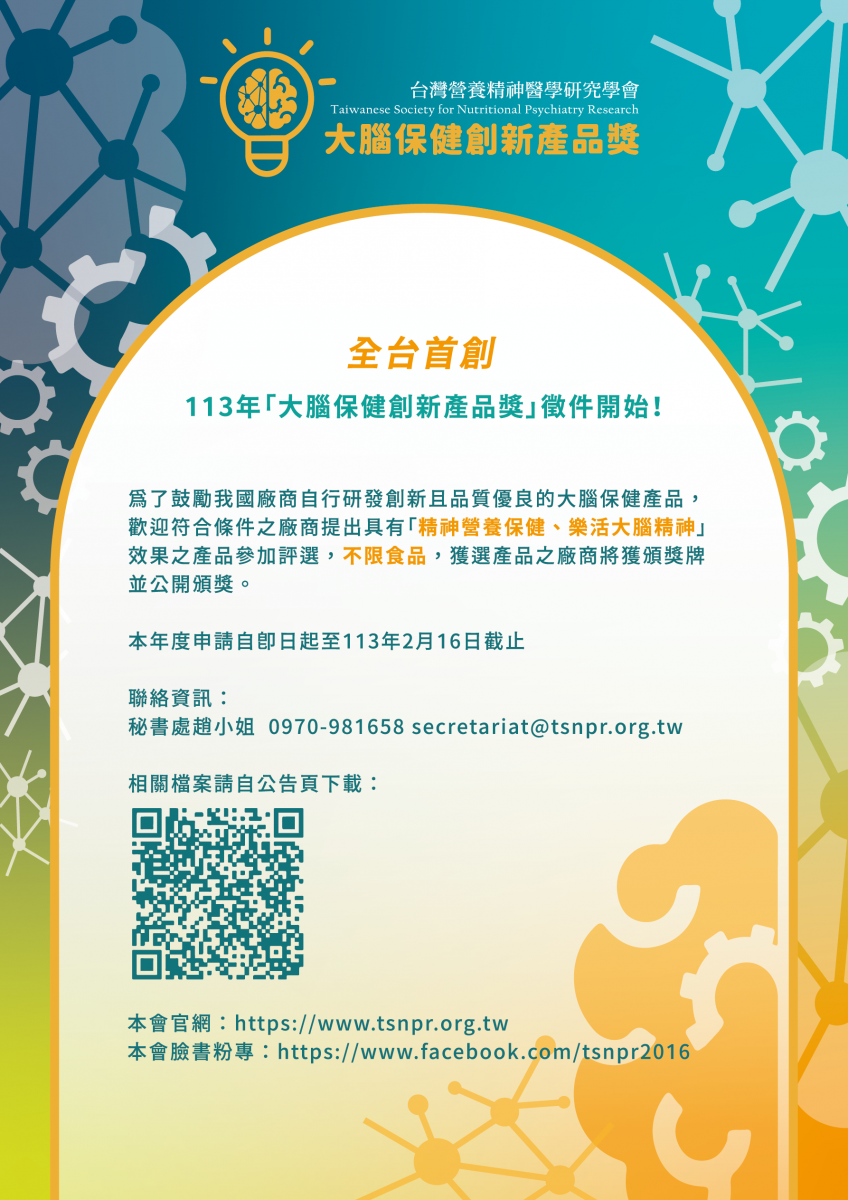 本年度徵件至113年2月16日中午止,歡迎符合條件之廠商提出具有「精神營養保健、樂活大腦精神」效果之產品,不限食品,參選結果將於113年3月15日前公告,獲選產品之廠商將獲頒獎牌乙面並於113年春季學術講座暨會員大會中進行公開頒獎。