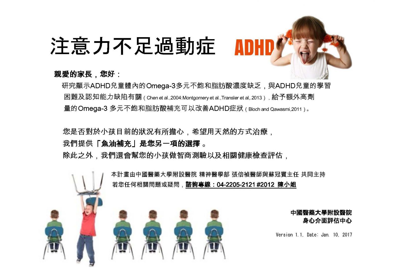 研究顯示補充Omega-3 (俗稱魚油) 可以改善ADHD注意力不足過動兒的症狀!如果您或您的孩子是6-18歲,且對這個治療方式有興趣,歡迎洽詢中國醫藥大學附設醫院張倍禎醫師所領導的的研究團隊。聯絡方式:陳護理師,04-22052121分機 2012,mindbodyinterface@gmail.com