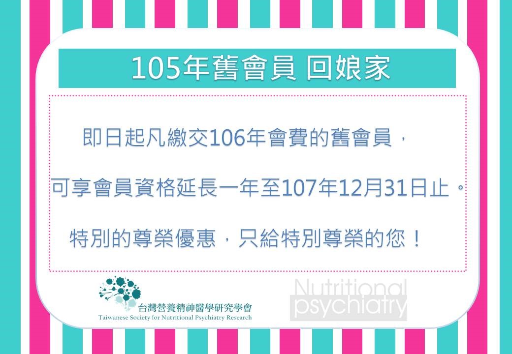 在此,要特別提醒您:106年度會員常年會費,已可以開始繳交囉!為避免影響您的會員權益並促進學會正常健康的發展,也讓學會能持續推動營養精神醫學研究,請您盡速繳交會費。我們特別針對105年的舊會員提供一個尊榮的優惠,凡完成106年會費繳交的舊會員,將可自動延長一年的會員資格至107年12月31日。會員可享學術活動報名費的各項優惠,並獲得學會最新的資訊與學術新知!謝謝!