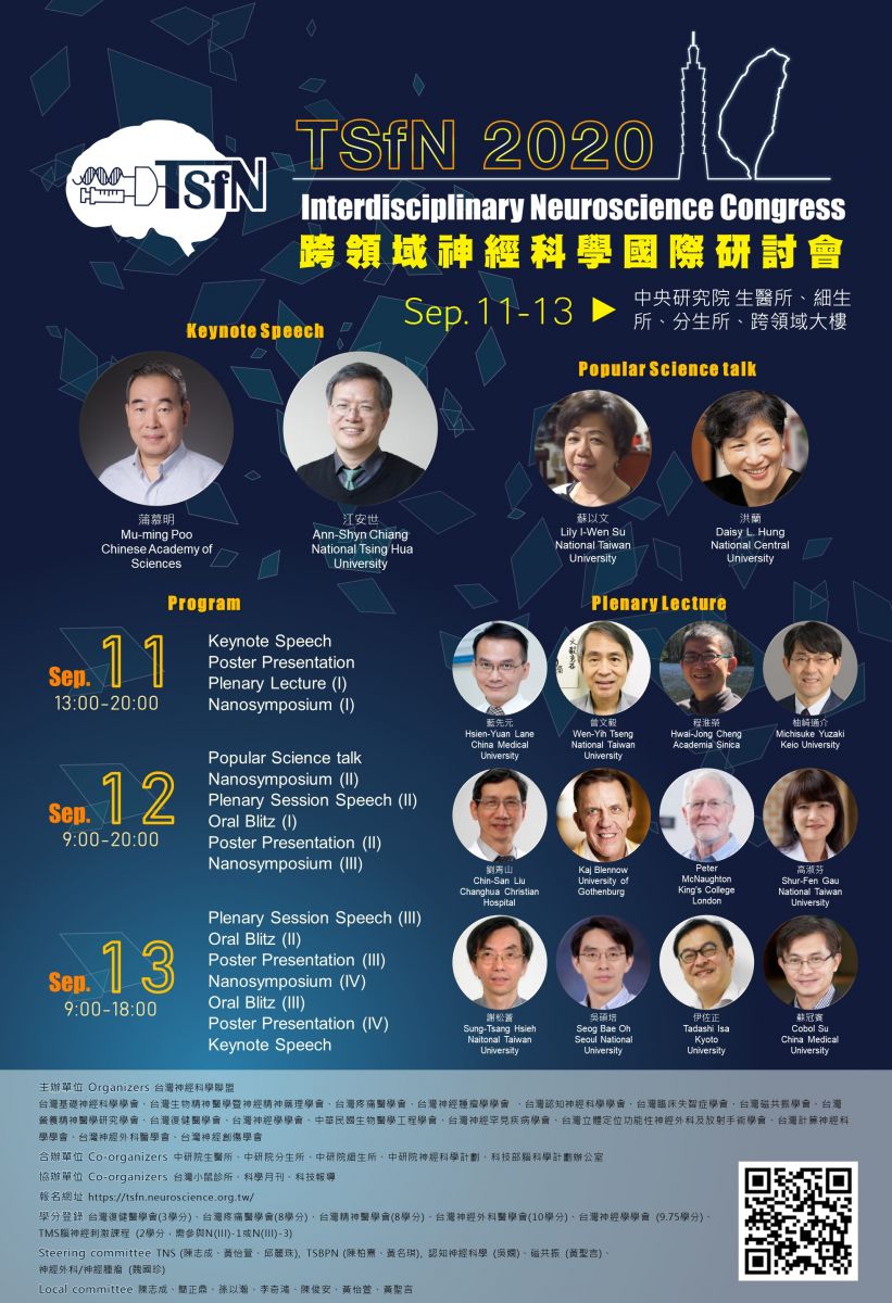 台灣神經科學聯盟 (Taiwan Society for Neuroscience) 是由17個相關領域的學會組成,將於今年9月11~13日於中研院舉辦首屆會議。由本學會理事長蘇冠賓教授帶領,與張倍禎醫師、陳君明博士,杜政昊博士以及澳門大學蘇煥興教授所組成的團隊將於大會進行專題報告!