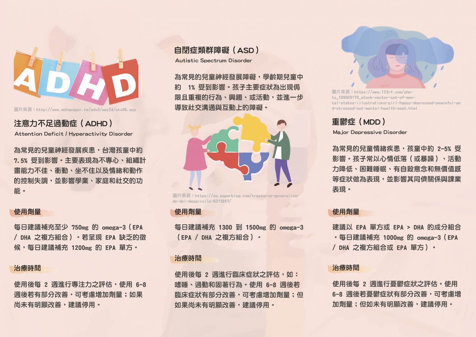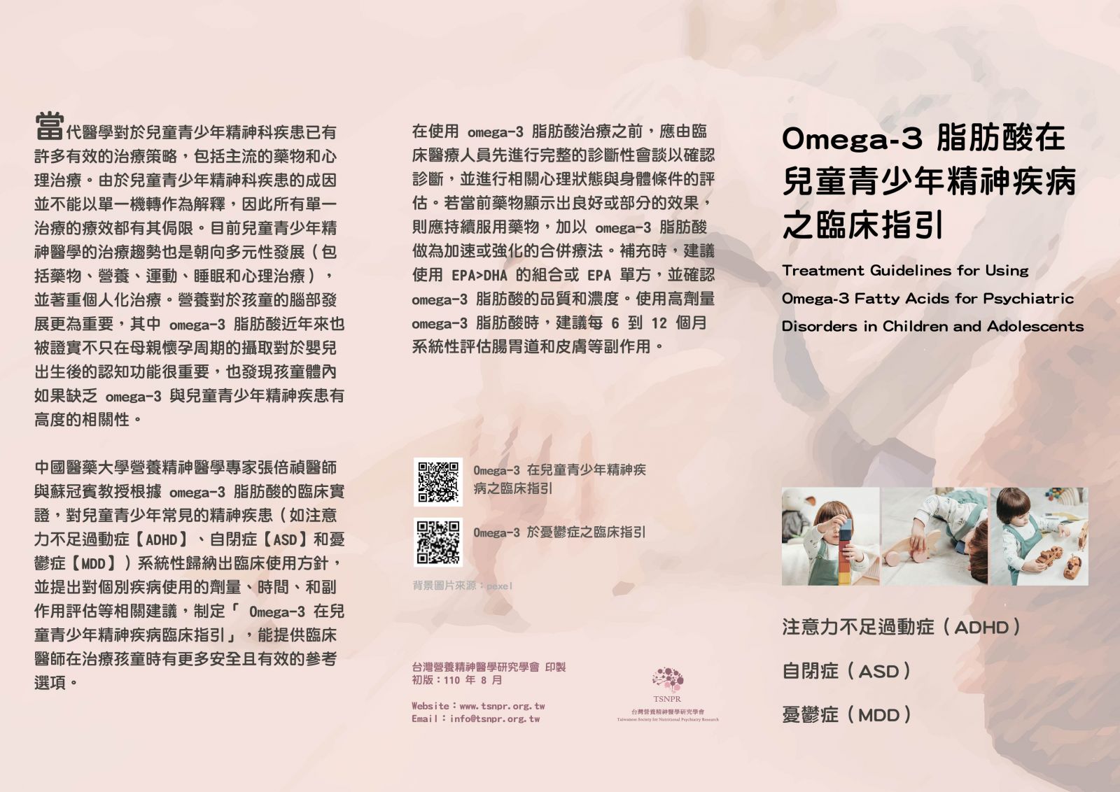 這篇指引針對Omega-3脂肪酸在注意力不足過動症、自閉症和兒童青少年重鬱症的臨床試驗成效的結果,並且歸納出具體的臨床使用方針,對於個別疾病所使用的劑量、時間、評估,甚至副作用,可以提供臨床醫師很大的協助。