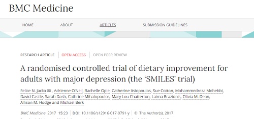 膳食改善與憂鬱症治療的關係。2017年BMC Medicine刊登了澳大利亞隨機對照臨床試驗,其為首次調查膳食改善與憂鬱症治療的關係,這項研究針對飲食品質不良的67名中度憂鬱症患者隨機分組進行飲食改善的研究,研究結果指出當中度憂鬱症患者依從Mod iMedDiet飲食改善10%,其憂鬱量表MADRS將減少2.2分,而介入組與對照組在結果上具顯著差異,憂鬱症狀相較於對照組具有顯著性的減少,這說明了飲食改善對於中度憂鬱症患者的治療具有幫助。