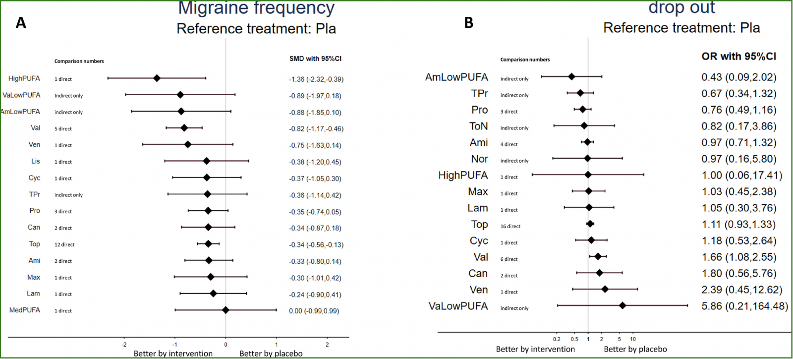 分析結果顯示,高劑量EPA/DHA補充劑 (HighPUFA) 與valproate 及 topiramate與安慰劑相比,對於偏頭痛天數明顯改善,而其中以高劑量EPA/DHA補充劑的效果最佳。此外,高劑量EPA/DHA補充劑在所有預防性治療中表現出最理想的接受度(與安慰劑相比 odds ratio: 1.00;95%CI: 0.06,17.41)。