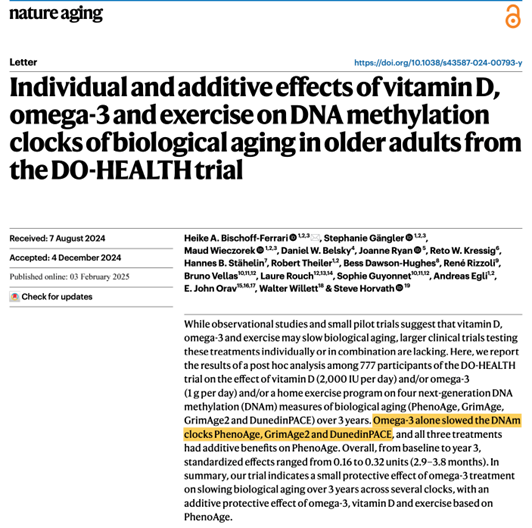 參考資料:Bischoff-Ferrari HA, Gängler S, Wieczorek M, Belsky DW, Ryan J, Kressig RW, Stähelin HB, Theiler R, Dawson-Hughes B, Rizzoli R, Vellas B, Rouch L, Guyonnet S, Egli A, Orav EJ, Willett W, Horvath S. Individual and additive effects of vitamin D, omega-3 and exercise on DNA methylation clocks of biological aging in older adults from the DO-HEALTH trial. Nature Aging 2025 Feb 3. doi: 10.1038/s43587-024-00793-y. Epub ahead of print. PMID: 39900648. https://pubmed.ncbi.nlm.nih.gov/39900648/