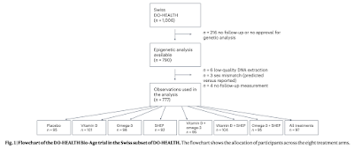 這項研究的基礎是 DO-HEALTH 臨床試驗,總共招募了來自歐洲五個國家、超過兩千名70歲以上的健康長者。研究時間長達三年,研究人員會定期追蹤參與者的健康狀況,並收集血液樣本,進行 DNA 甲基化分析。研究的設計是一個 2x2x2 factorial design,也就是說,參與者會被隨機分配到八個不同的組別,分別接受以下幾種治療:(1) Omega-3脂肪酸 (1克/天);(2) 維生素D (2,000 IU/天);(3) 居家運動計畫 (SHEP,每週三次,每次30分鐘)