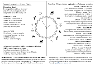 Extended Data Figure 1 主要解釋 DNA 甲基化時鐘、老化速度,以及基於 GrimAge 的血漿蛋白。第二代 DNA 甲基化時鐘 (如 PhenoAge、GrimAge) 可以測量生物老化,這些時鐘與生活方式因素密切相關。老化速度 (DunedinPACE) 則評估個體器官系統的衰退速度。基於 GrimAge 的血漿蛋白是量化指標,數值越高代表死亡風險越高,這些蛋白與腎功能、粒線體功能、血液凝固和發炎反應有關。圖中也使用了許多圖示,呈現這些生物標記與生活方式的關聯性。簡而言之,Extended Data Figure 1 提供了關於老化測量指標的概觀,強調生活方式對生物老化的影響,並解釋了不同老化指標的意義。